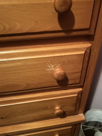 Second drawer handle has a small amount of scratching, as shown in picture.