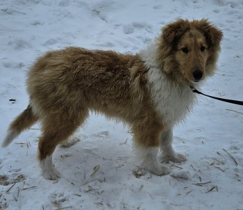 Jasper has a gentle manner. He comes quickly to either his name or a whistle. He travels okay. He is learning to sit. He has first vet check, vaccines and dewormed. I can send his record with him. He has been an outside dog and does well even with the cold if he has a good shelter. Not house trained. He has been around poultry and livestock with no problem.