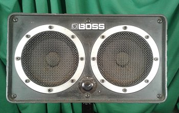 2 BOSS MS-100A speakers. (See pic for specs) includes short mic stand for each. Ideal for band work as outputs or monitors.