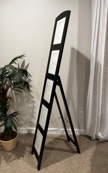 Black wooden standing photo frame holds five 5x7 photos. New condition. 64 inches high, 11.25 inches wide.