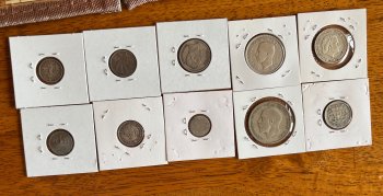 10 International silver coins with a combined Actual Silver Weight of 1.0103 ounces of silver. The coins are well circulated and of value mainly for the silver content. My price reflects the melt value only as of February 12, 2025. The coins on offer and their Actual Silver Weight are as follows: 1928 UK half crown (.2273), 1938 UK 2 shillings (.1818), 1941 Philippines 10 centavos (.0482), 1936 Switzerland half franc (.0671), 1942 Uruguay 20 centavos (.0694), 1939 Netherlands Indies 1/10 gulden (.0289), 1954 Venezuela bolivar (.1342), 1951 Portugal 2 1/2 escudos (.0731), 1956 Netherlands gulden (.1505) and 1945 Sweden 25 ore (.0298).