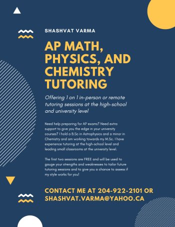 Need help preparing for AP exams? Need extra support to give you the edge in your university courses? I hold a B.Sc in Astrophysics and a minor in Chemistry and am working towards my M.Sc. I have experience tutoring at the high-school level and leading small classrooms at the university level.