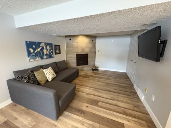 - Updated kitchen featuring modern cabinetry, quartz countertops & island seating