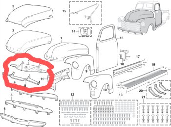 Looking for radiator support pieces, latch panel, lower aprons, tailgate, door hardware, inner windshield trim, 216 or early 235 valve cover and cooling fan. 1947-54 Chevy 1/2 to 1 ton should work.