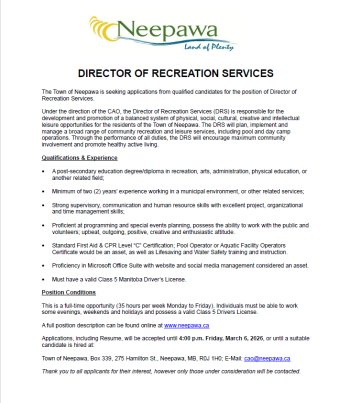 The Town of Neepawa is seeking applications from qualified candidates for the position of Director of Recreation Services.
