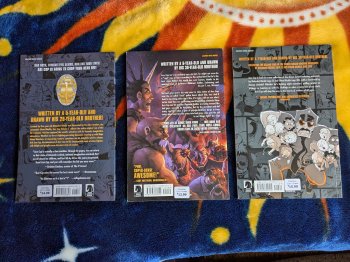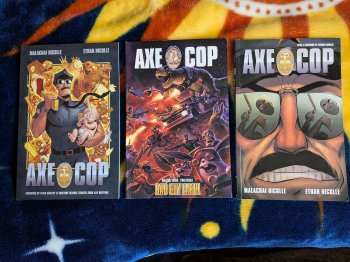 Axe Cop trade paper back Vol 1-3 published by Dark Horse Comics in excellent second hand condition. Ordered on eBay, asking price is less than I paid, if you can find them cheaper somewhere else, buy them!