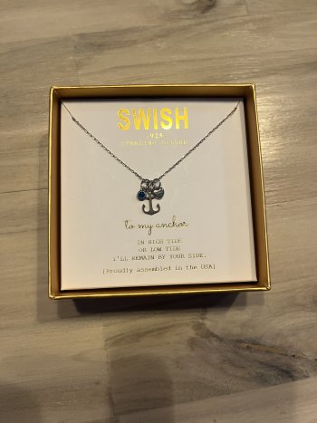 Shiny SWISH sterling silver necklace with a cute anchor charm, a little blue charm, and a heart charm. Comes with the original box and card that says 'to my anchor in high tide or low tide I'll remain by your side'. Great gift idea!