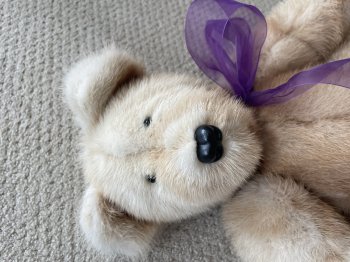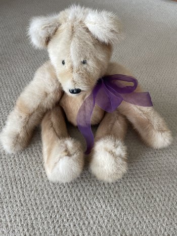 Cute fur bear. 12 in high and 21 in long. Not sure of the kind of fur