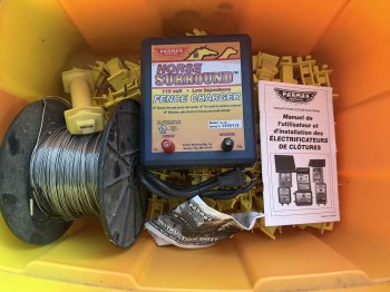 This is a 110v electric fence charger with 400? spool of wire, wire gate handle, insulators and nails. System has never been used, and comes with instructions. Perfect for protecting your garden from deer.