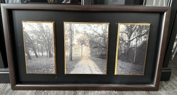Has three panels with cool forest scenes. Dark brown frame, black matting, and gold accents around each picture.