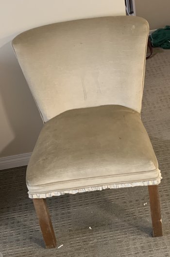 Upholstery beeds cleaning. Wooden legs have a few scuffs. Price reflects this.
