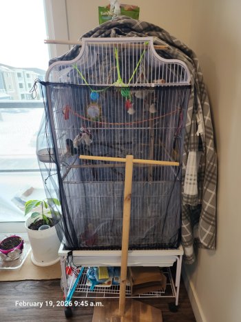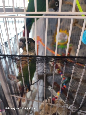 A pair of young conures with cage and accessories all together. Not separating and everything needs to go with them.