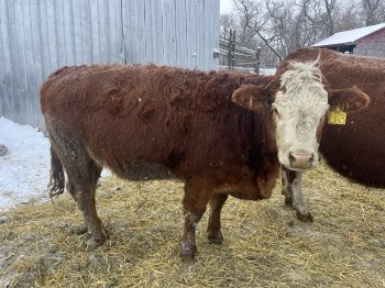 Have for sale a bred Simmental Heifer. She is 2 1/2 years old. Did an internal on her today and has a calf in her but will be a summer calf. Can get checked at vet for a more definitive date but have to wait for appointment. She is bred to a shorthorn bull. We are Jan Feb calving season so she is just too late for us. Calm temperament. We don?t keep anything that is spooky or hard to work with.