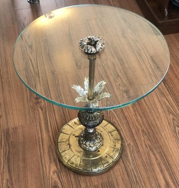 -18?High Antique Brass & Glass Side Table With A Substantial Ornate Pedestal Base With Carved/Embossed Leaf Motif Or Floral Detailing