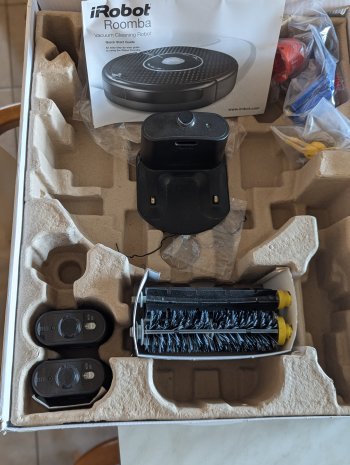 iRobot Roomba Black 595 Pet Series Robotic Vacuum with Accessories and Manual. The unit is in good working. It comes with the original documentation, NEW brushes, NEW filter, the dock, door/stair sensors, and the original power adapter. NEW battery.