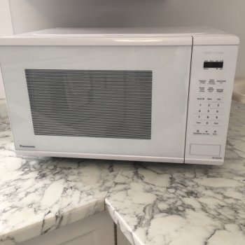 Panasonic microwave new. Reason for selling won’t fit into the space I have. 1.3 cubic ft, 1100 w, size is 20”wide, 16” deep, 13” high.