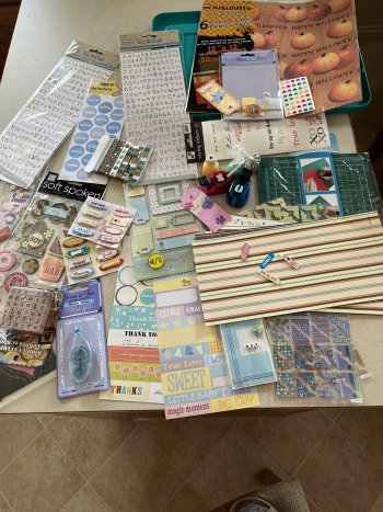 Large variety of items, stickers, borders, punches, wooden alphabet stamps, small cutting board, etc. Most in unopened packages.
