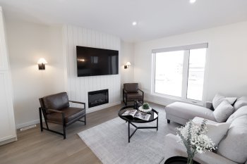 • Open-concept living space anchored by a statement fireplace