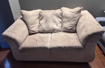 Gently used loveseat with plenty of life left. The cushions remain supportive and comfortable, and the frame is structurally solid.