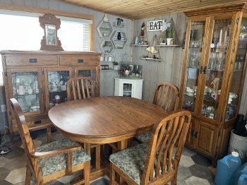 Dining suite that does not fit renovations in our cottage. This is a solid oak item. Leaded glass doors. Interior lighting. 2 leaves. Paid $5500 a long time ago. Must go $1500 firm. Call (204) 724-5203.