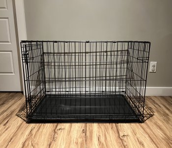 Lightly used size-large foldable dog crate with plastic tray. Measures 36 inches (length) x 23 inches (width) x 25 inch (height). In excellent condition, dog just outgrew it and needs something bigger.
