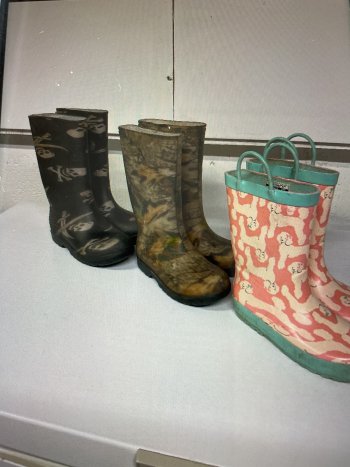 3 Pair of Children?s Footwear in Good Condition , Skull Rainboots size 1, Camo Boots size 12, Pink Boots size 11, asking $10.00 each.