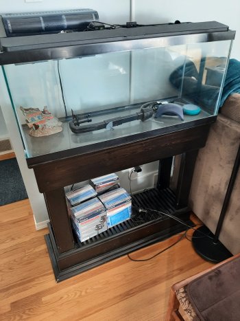 Aquarium with optional pine stand. includes used, as is, dual filter system and new carbon filters. Aquarium alone with accessories is $25.00. Custom-built stand alone is $25.00. Or, if you buy everything, the price will be reduced to $40.00.