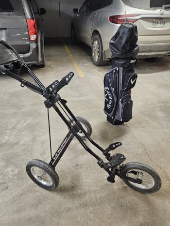 Golf season is rapidly approaching, take a look at these items for sale at a great price. Sun Mountain Speed Cart, 3 wheels with front wheel brake to hold on a slope, and a Callaway bag in nice condition, plus 6 Titleist irons 3, 2x4, 5, 6, 8 and a pitching wedge. Take everything for $100.00, or the bag and irons for $50.00, and the Sun Mountain cart for $75.00. Call or text 403-978-6060 or use the link for email. Prices are pretty firm and reasonable, and if the ad is still up, the sale is still going on so don't ask "is this still available" as you won't get a reply.