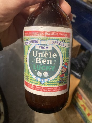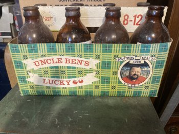 8 pack of pop bottles and cardboard case of uncle Ben?s lucky. Stubby bottles and labels with cardboard case in good shape. 150$ for all