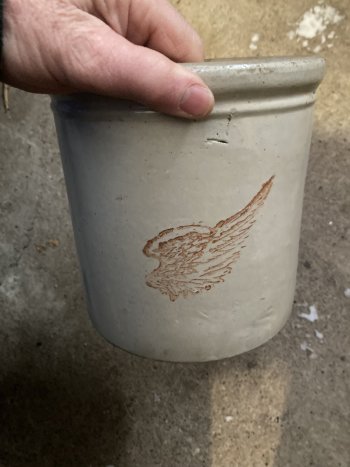 One gallon redwing crock, has crack on backside, still very stable and displayable, 250$