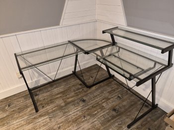 59" x 59" glass and metal corner desk in like new condition with pull out keyboard tray. Two full corner desks available. Take both for 250$. Both together makes perfect wrap around desk in 10ft wide room