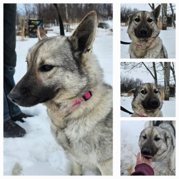 Female Norwegian elkhound. Almost 2 years old. Intact. Rabies up to date. She is very smart, very pretty, good with people & other dogs. Lots of energy. She can't be with small livestock. She's always been outdoors & does excellent outdoors in winter.
