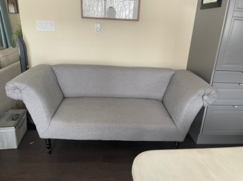 Grey chase with blue fleck good used condition slight scratches on legs L76”x28”W seat depth 22” Floor to seat 18”