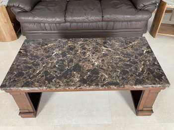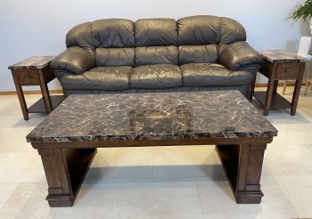 Coffee table with bench and two matching end tables in good condition for sale.