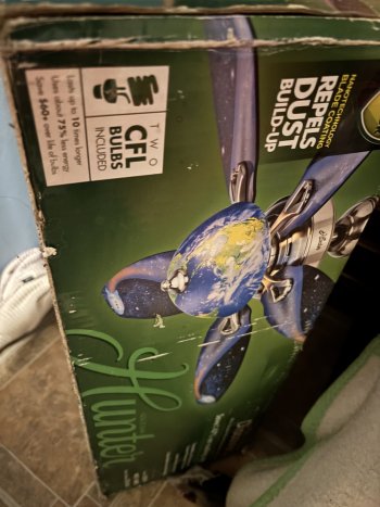 Brighten up your home with this brand new in box Hunter brand ceiling fan featuring a unique world globe design. This used fan includes two CFL bulbs and boasts a dust-repelling blade coating, ensuring easy maintenance and long-lasting use. The blades have a custom galaxy paint job.