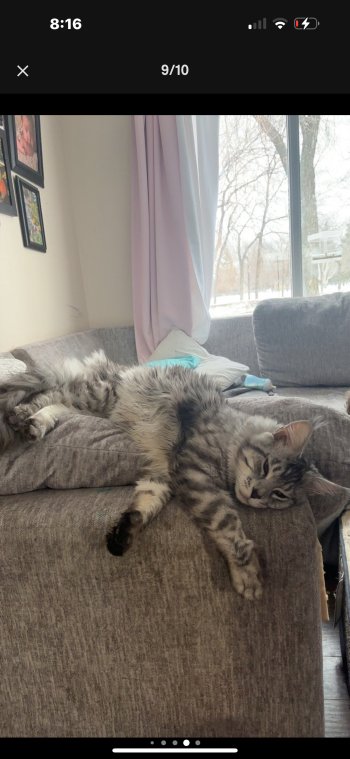 Mom is a short hair domestic. She is mostly white with orange and grey blotches to her. Dad is a 19lb silver tabby Russian Maine Coon.