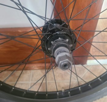 New 20" bmx wheel ( front & rear) 36 spoke, 3/8th front/ 14mm rear 9 tooth hubs. Used good tires on them, lots of life on them.