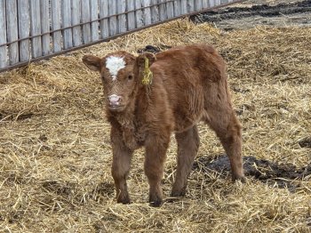 First red calf. Heifer. Born March 7. Twin to bull. Smaller. 18