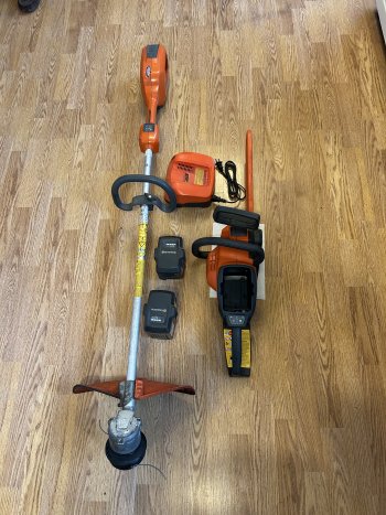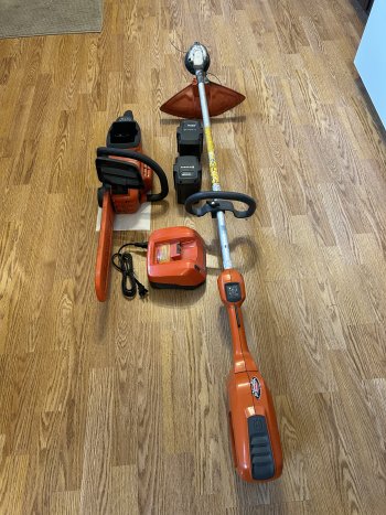 Husqvarna power battery chain saw and weed wacker. 2 batteries and charger