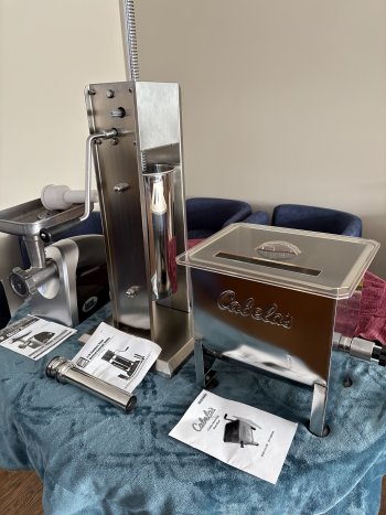 Would like to sell together. 6 food grade meat lugs (2 x 50 lb and 4 x 20 lb), 4 lug lids, 11 lb stainless steel sausage stuffer, 4 gallon countertop stainless steel meat mixer, LEM #8 meat grinder. Excellent condition. Easy to use. Very well maintained. All books and attachments included. Cash or e-transfer confirmation upon pickup only.