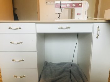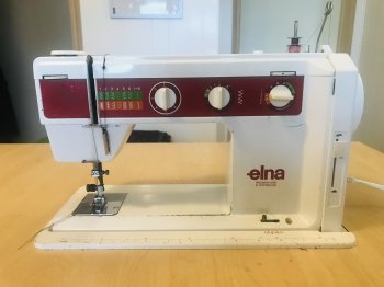elna jubilee sewing machine and cabinet with drawer and cabinet storage. In great working condition. Stitch sample in last photo.
