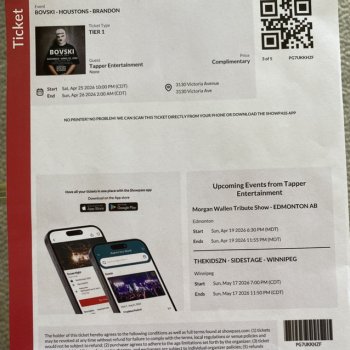 Hi I have 5 tickets to Bovski at Houston’s make me an offer 204-526-7889