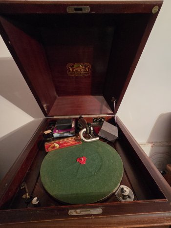 RCA VICTOR record player, wind up, speakers. Fair condition, works, requires new diamond needle. Firm