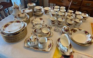 13 Large dinner plates, 13 lunch plates, 1 large serving plate with scalloped handles, 2 gravy boats & tray, 2 coffee pots, 18 cups & saucers, 12 mugs, 18 dessert plates, medium cream & sugar, large cream & sugar with tray, small cream & sugar with tray, 2 x S&P sets, 4 napkin holders, butter server and knife, candy dishes 1 square and 1 round, pickle dish, 6 soup bowls and saucers, 2 round serving bowls, 1 oval serving bowl, 2 luncheon plates & cups.