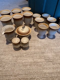 Vintage Johnson Bros Snowhite Ironstone, Regency R121-62, Made in England, Sovereign Potters. 18 plates, 12 cups, 14 saucers, 22 luncheon plates, 10 dessert bowls, 12 soup bowls, 2 serving bowls, S&P. Circa 1960's. Silver platinum scroll around scalloped edges. Asking $200