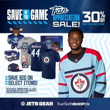 That night is Fan Appreciation Night. ALL FANS IN ATTENDANCE WILL RECEIVE A MYSTERY PRIZE & A FREE FOUNTAIN DRINK! In addition, there will be all kinds of GIVEAWAYS throughout the game, plus 30% OFF most in-stock merch at Jets Gear!