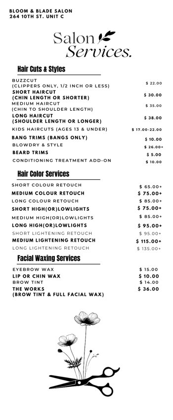 Hello there! My name is Jenna Bardarson and I am a licensed stylist of 15 years. I've just opened a salon, Bloom & Blade and am now accepting new clients! To book an appointment please call or text (431)270-0122 or go to bloombladebdn.ca for online booking!
