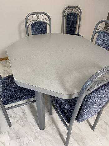 Excellent condition. Grey table, 5 blue chairs and 2 leaves.