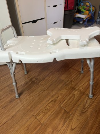 Shower chair with side extension over the side of tub. Can be used right or left. Option of back on or off adjustable for height. Pick up only.