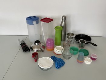 I have a variety of kitchen items that are all in clean and excellent condition. All the small plastic items are Tupperware as are the green glasses and the tall cheese holder.
